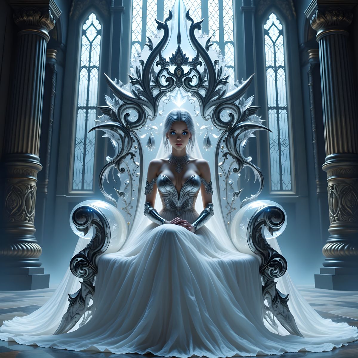 This masterpiece glass art shows a Norse goddess on a magnificent glass throne in a sparkling hall. The image features a black and white palette with subtle blue tones, evoking a sense of bittersweet sadness.