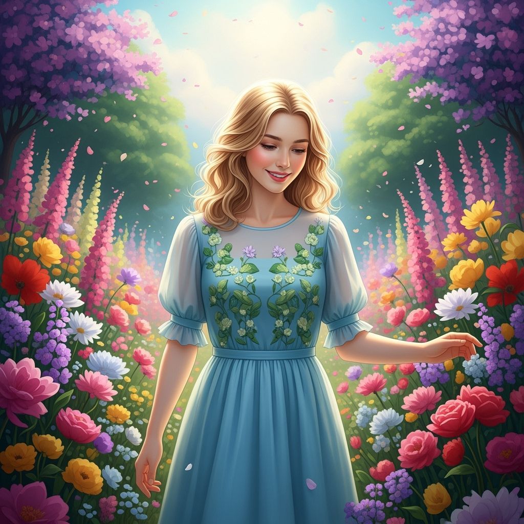 A serene blonde woman in a light blue floral dress walks down a flower-lined path. The image, reminiscent of modern figurative painting, features soft lighting and hyperrealistic textures.
