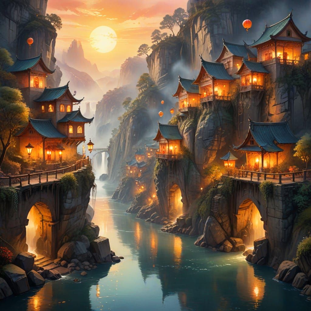 A watercolor painting depicts a vibrant fantasy city nestled on cascading cliffs. Thousands of houses and glowing lanterns adorn the landscape, with waterfalls and bridges enhancing the dreamy atmosphere.