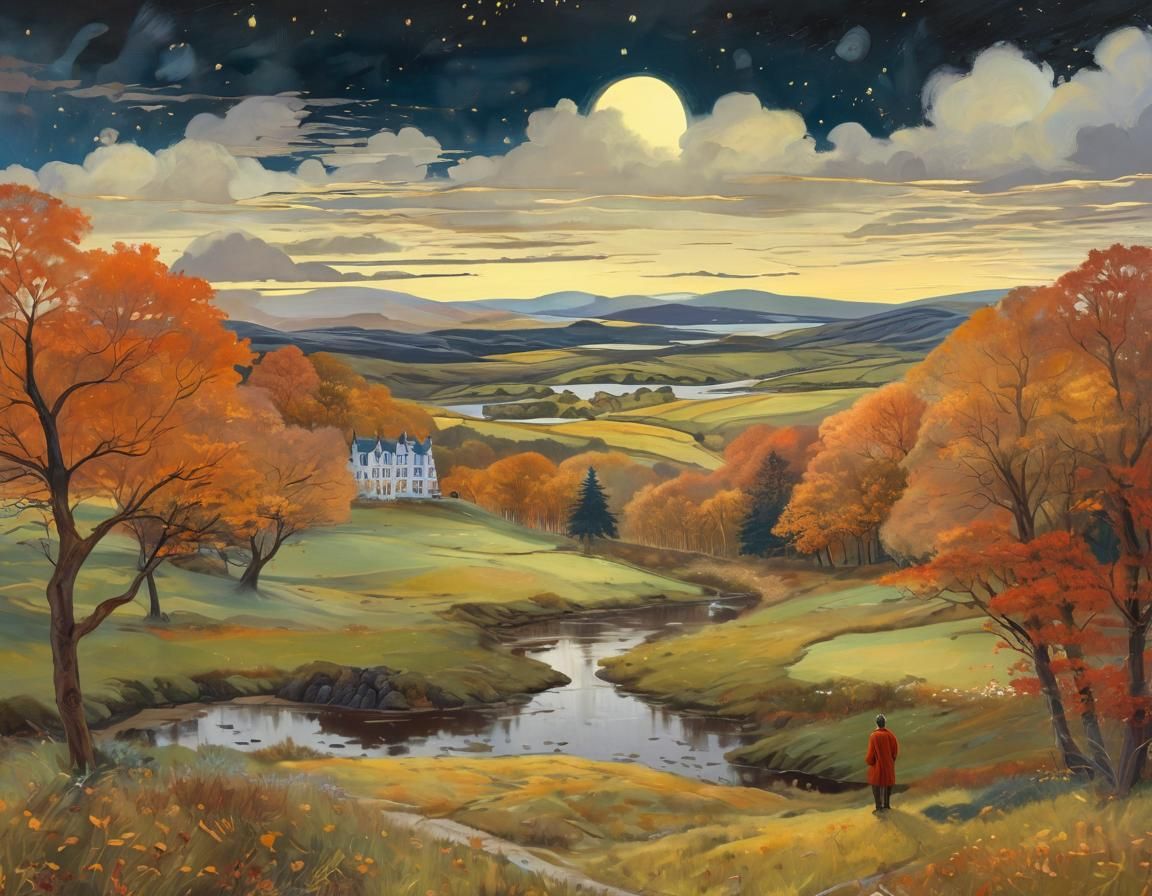 A vibrant image of a lone figure in a glowing Scottish autumn landscape after rain. Soft golden light filters through the trees in this intricately detailed oil painting with warm earthy tones.