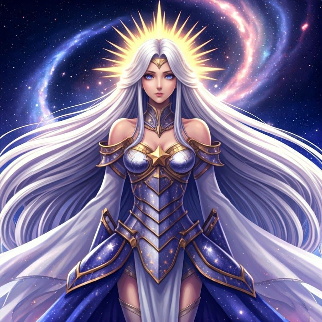 This image showcases a powerful anime queen set amidst a stunning galaxy backdrop, radiating elegance and mystique.