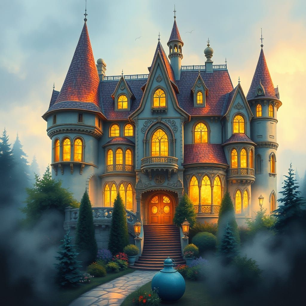This enchanting image features a majestic fairy tale mansion shrouded in ethereal mist, with intricate textures and thick brushstrokes, reminiscent of Impressionist masterpieces.