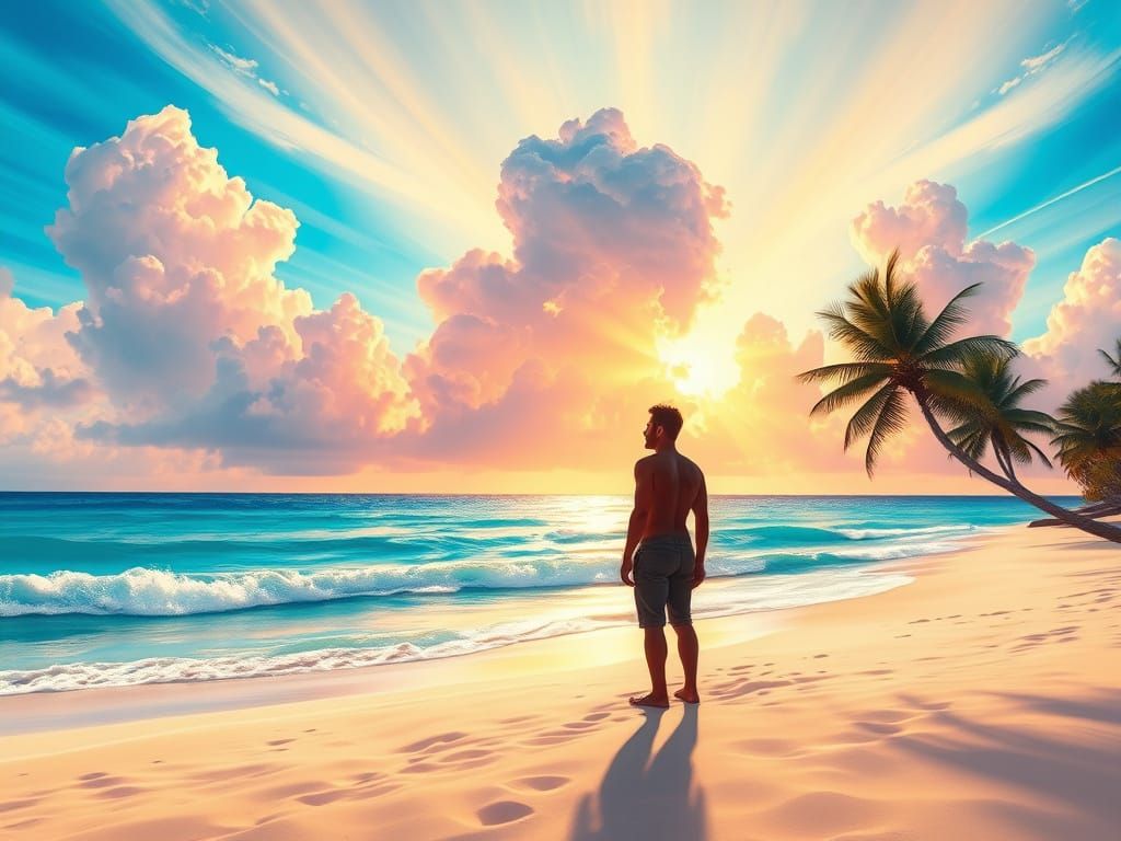 This image shows a serene and idyllic Caribbean beach scene, with soft golden sands, gentle turquoise waves, and vibrant coral reefs, set against a radiant pastel-hued sky and clouds, with swaying palm trees and a sense of boundless freedom.