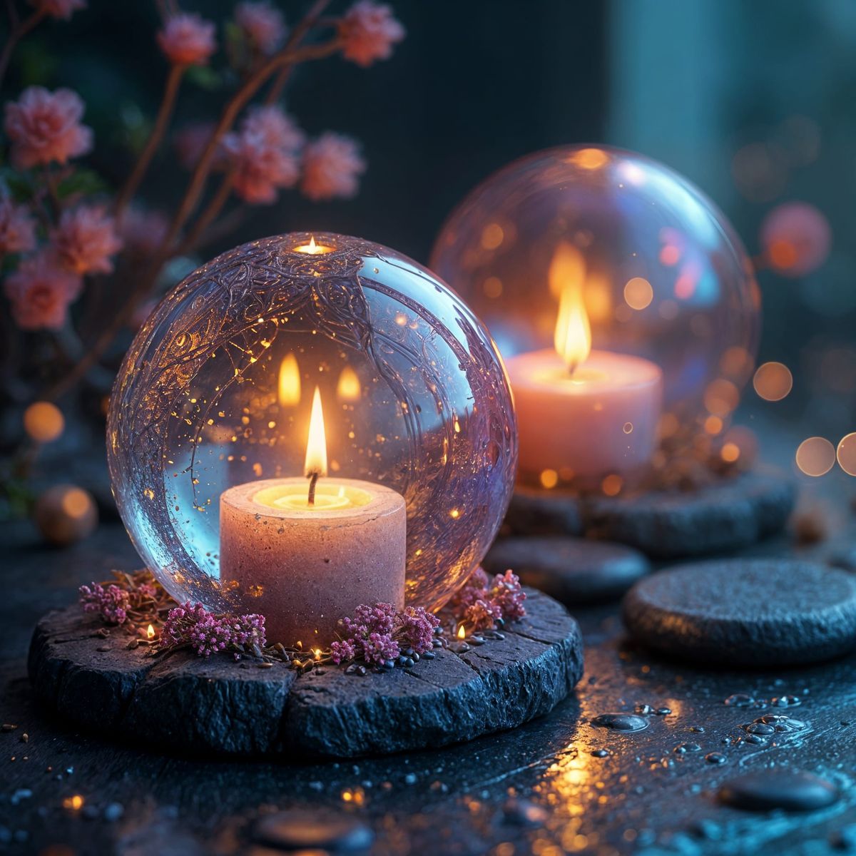 This captivating image showcases candles within multicolored glass orbs, set against a deeply colored, hyperrealistic backdrop, blending fantasy and atmospheric elements.