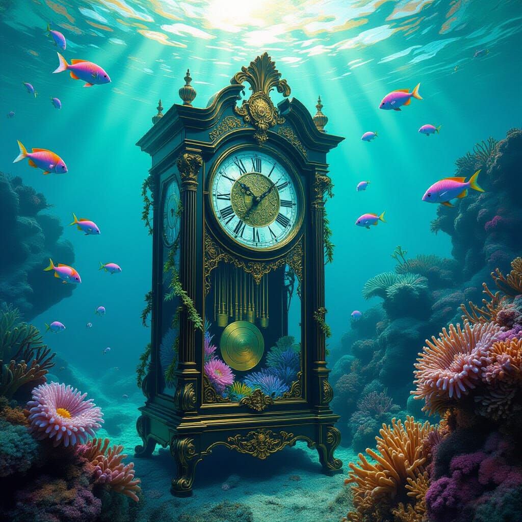 A surreal scene of an ornate grandfather clock partially submerged in a vibrant coral reef filled with alien marine life. Sunlight creates dappled patterns in this dreamlike, underwater world.