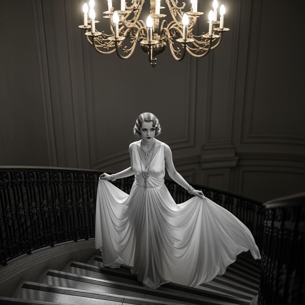 A photograph shows a woman in a pearl gown walking down a spiral staircase. The image is monochromatic and reminiscent of 1920s fashion photography.