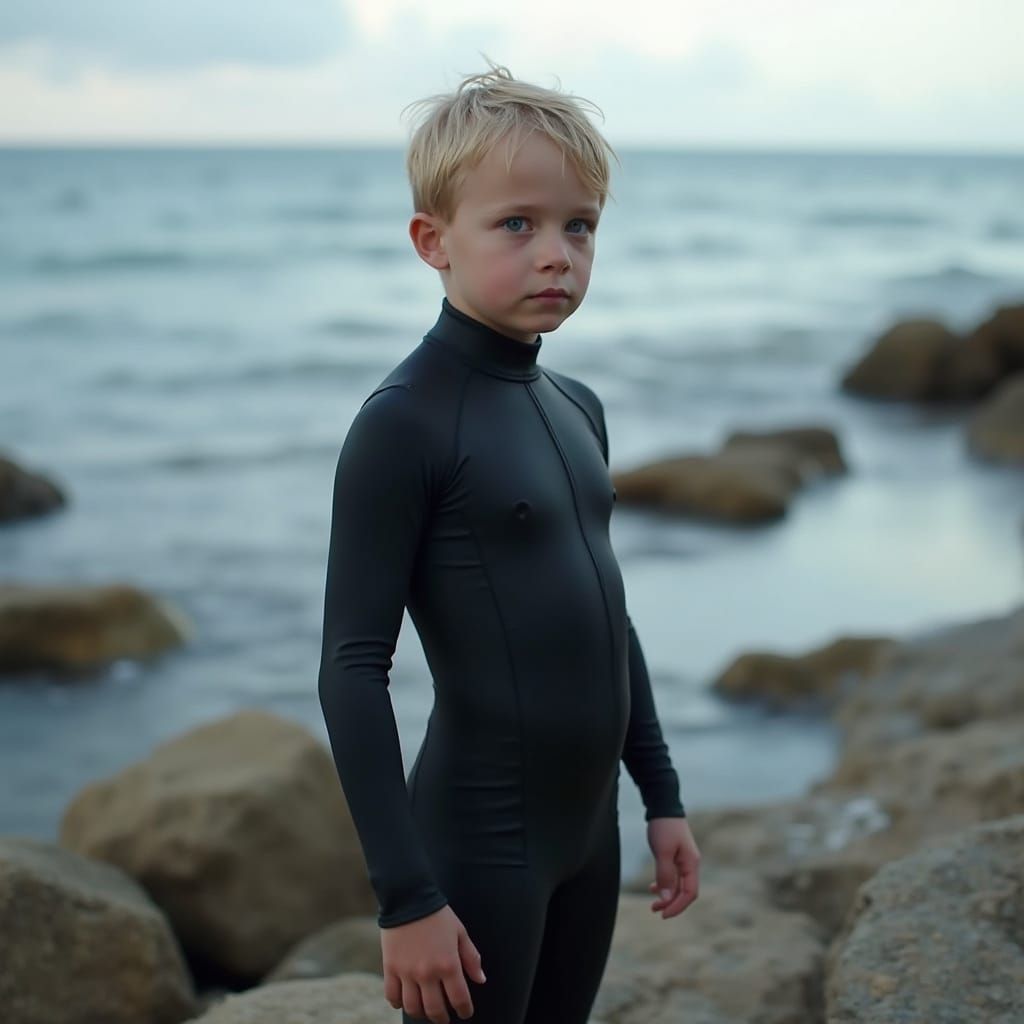 A striking picture of a young boy on a rocky shore wearing a sleek black wetsuit. The image has a cinematic quality and a futuristic aesthetic inspired by concept art.