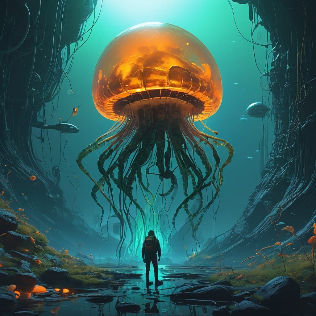 This image shows a microscopic view of a cell containing a jellyfish and snail. It glows with emerald, blue and orange bioluminescence in a psychedelic, electron microscopy-inspired style.