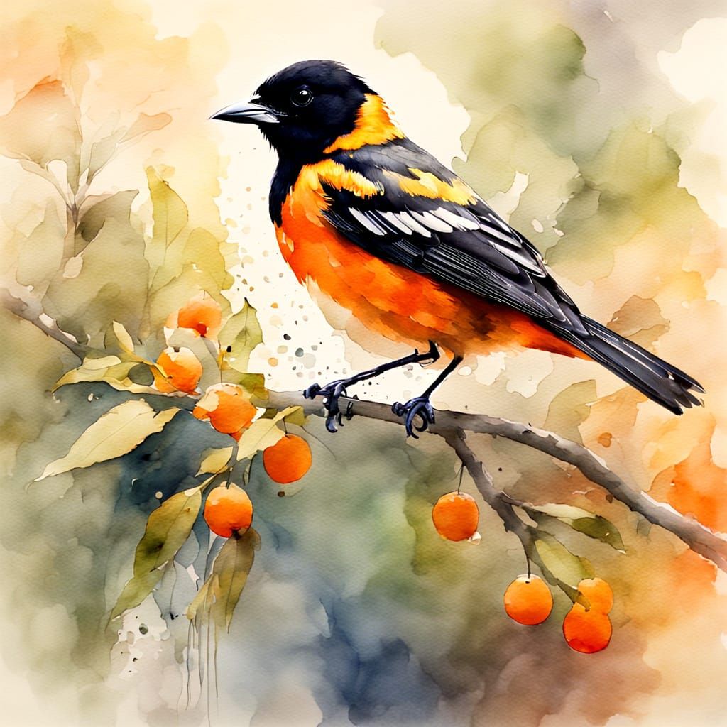 This image shows a vibrant oriole bird in a close-up, macro shot. The watercolor-style art features expressive brushstrokes, loose textures, and soft natural lighting, rendered with warm colors and high contrast.