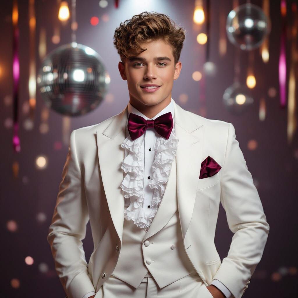 A hyperrealistic image of a teenage male dancer in a white tuxedo, featuring a ruffled shirt and a large burgundy bow tie. The scene is set against a prom background with cinematic lighting, evoking a vogue magazine cover style.