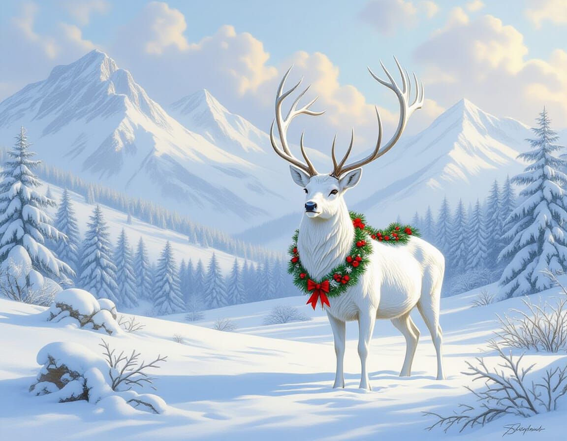 A striking picture of a majestic white stag in a snowy landscape. The stag wears a Christmas garland, evoking a sense of wonder and magic in a detailed fantasy scene.
