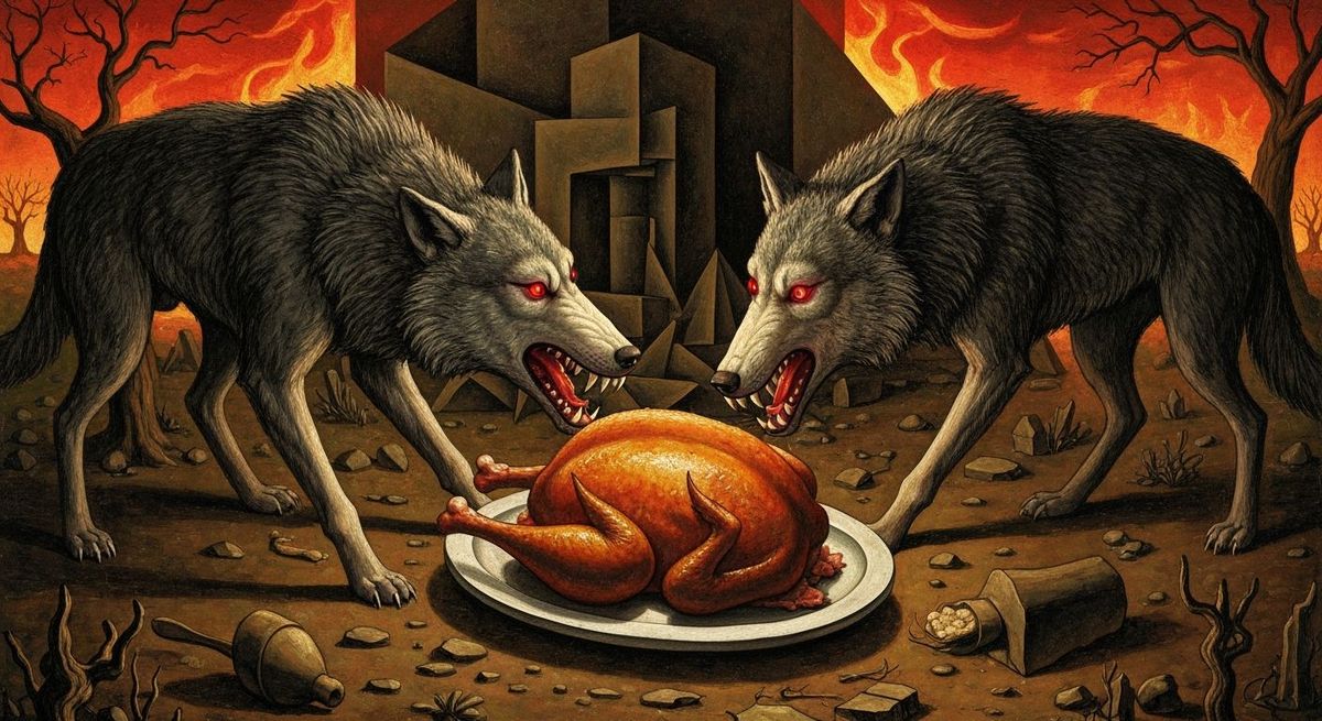 This image depicts two wolves with glowing red eyes devouring a roast turkey in a hellish Belgian landscape. The art style blends cubism, geometry, and narrative depth.