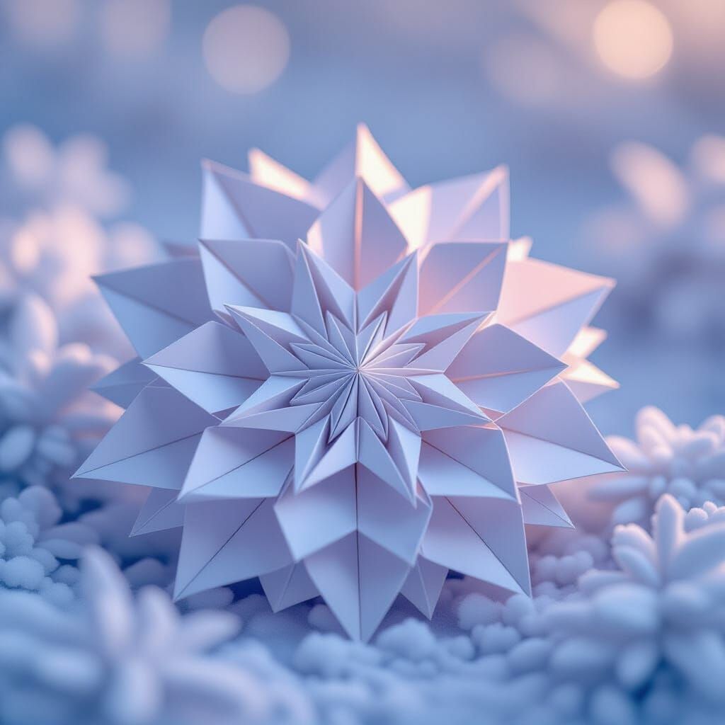 This image showcases a detailed papercraft replica of a frozen pogada, featuring precise folds and soft focus. Rendered in 8K with cool-toned, dawn-like lighting.