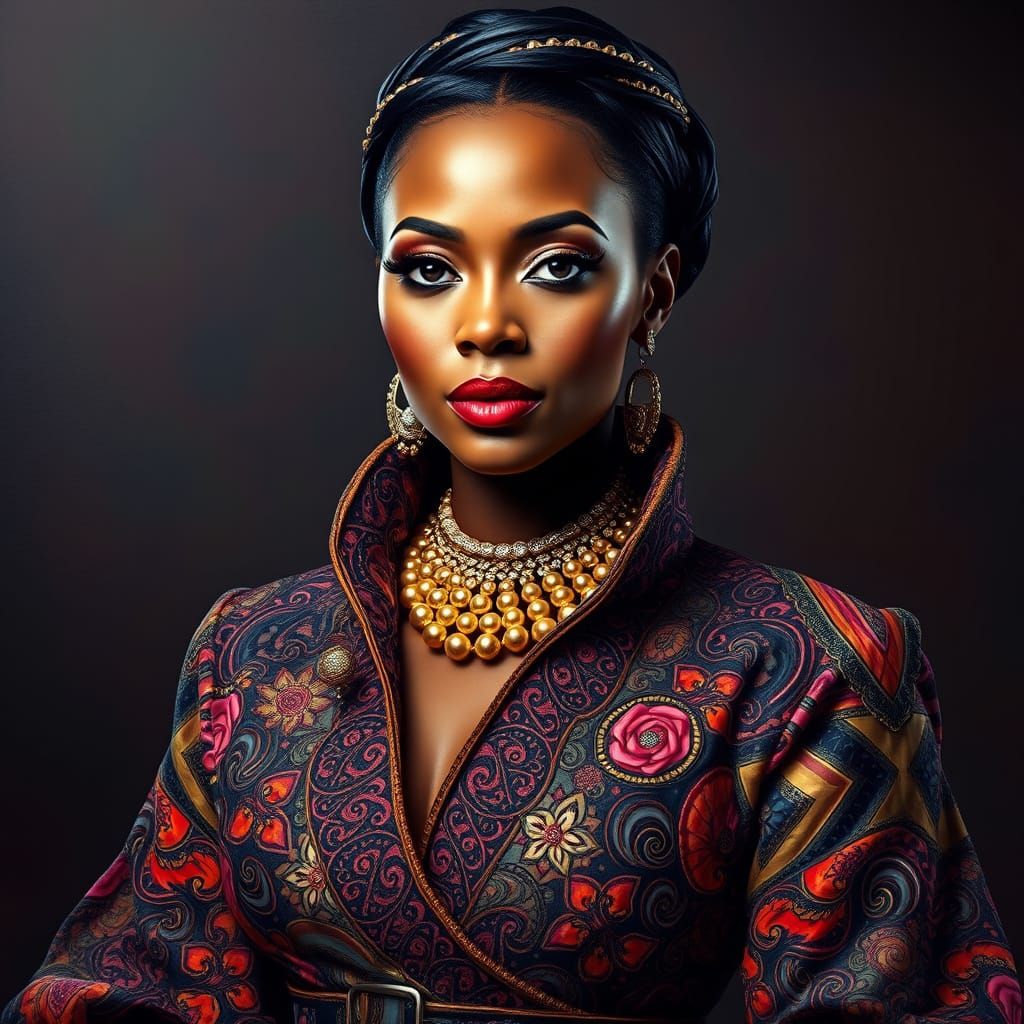This image showcases a regal woman in a richly detailed, textured outfit. The artwork features vibrant, layered mixed-media elements with dynamic lighting and a sophisticated color palette.