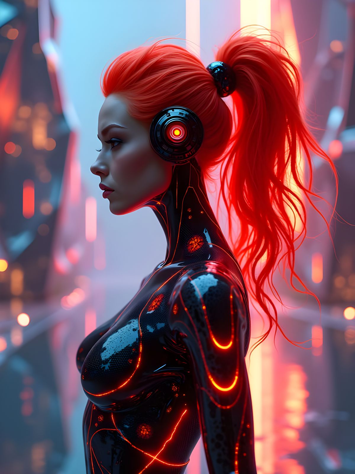 This 8K hyper-realistic image features a provocative female cyborg with fiery red hair and a biomechanical body, set against striking geometric architecture. The scene pulses with neon light and cinematic drama.