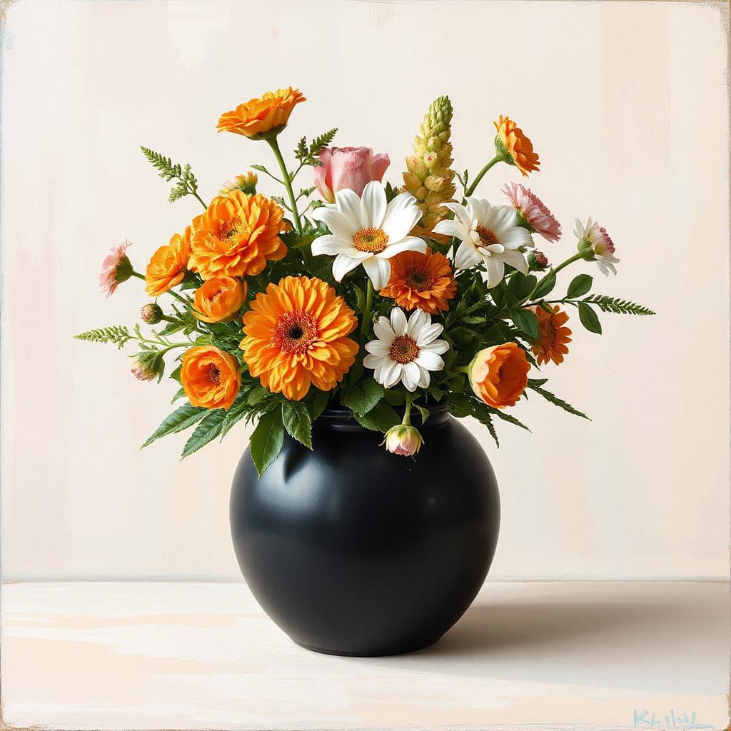 A striking picture of a black vase overflowing with vibrant orange, white, and pink flowers, complemented by lush green foliage. The artwork is rendered in a cheerful watercolor style with expressive paint splashes.