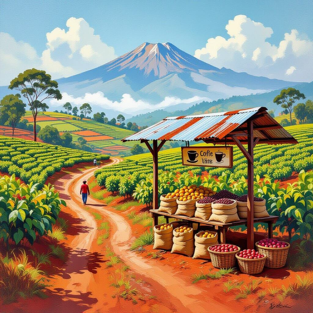 This image shows a rustic coffee farmstand on a red dirt road in the Kenyan highlands, displaying local produce. Painted with bold brushstrokes and saturated colors, it captures the essence of contemporary African art.