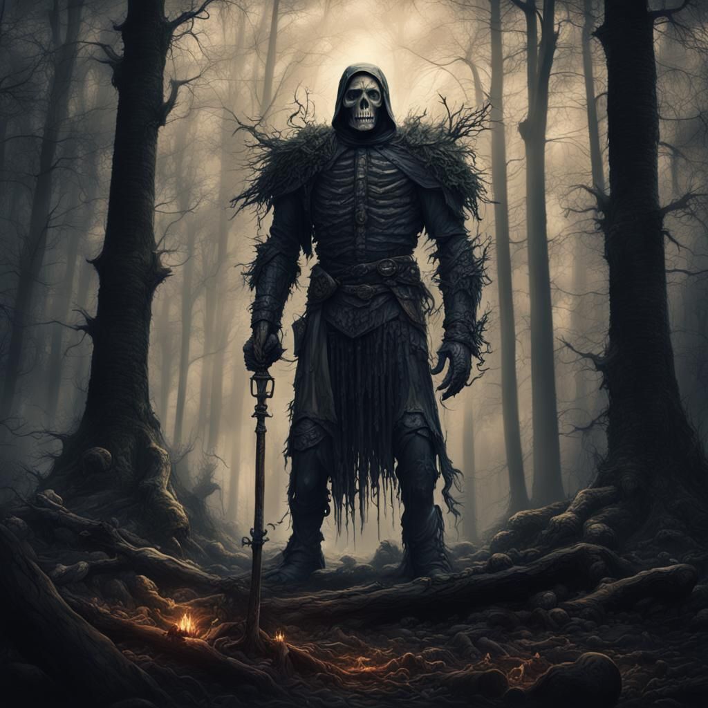 This image depicts Death patiently waiting for his love within a dark, atmospheric forest. Created as an epic, maximalist digital matte painting.