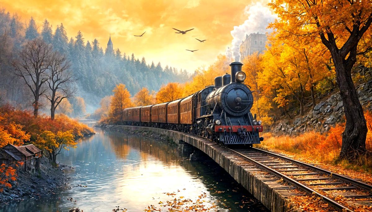 This hyper-detailed digital matte painting shows a vintage steam train on a stone arched bridge beside an autumnal village. Sailboats and rowboats dot the calm river.