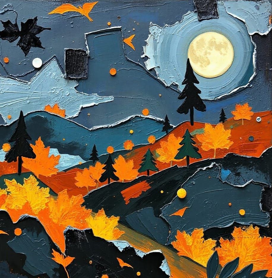 A striking abstract image capturing a surreal dusk scene with rich auburn tones, rendered in an impressionistic impasto painting style.