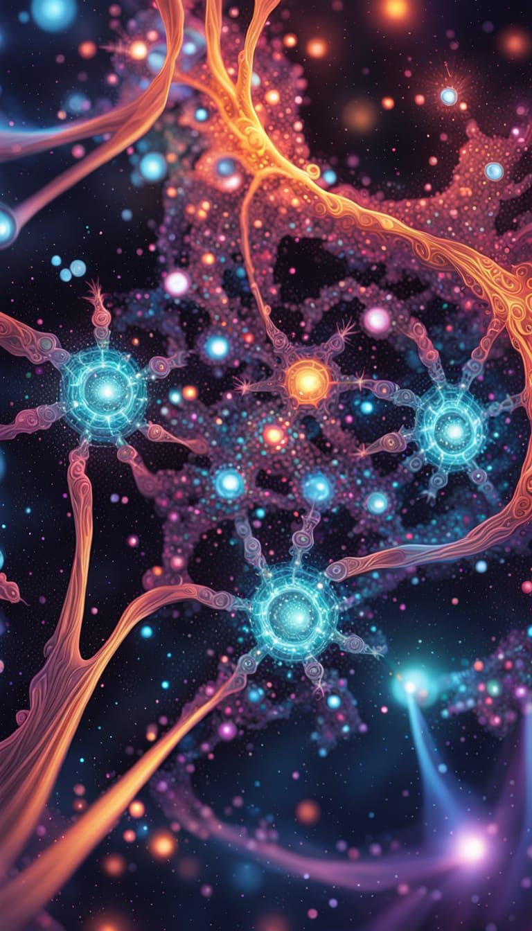 This digital art features a close-up of a cosmic skeleton formed from nebulae, swirling with intricate fractal patterns and emitting an ethereal glow. Rendered in vivid, psychedelic colors with sharp focus.