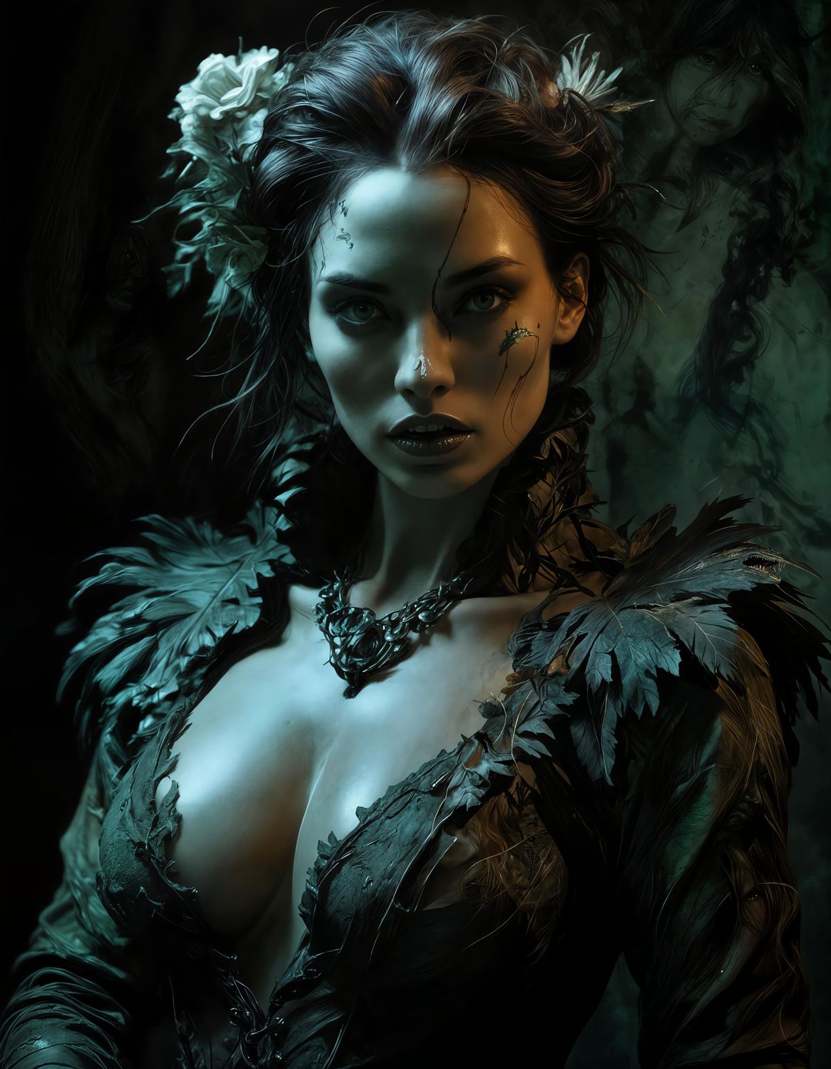 A striking picture of a taxidermist in a realist style portrait. The image features a dark, sensual mood with green tones, capturing a slightly deranged, dragonoid beauty.