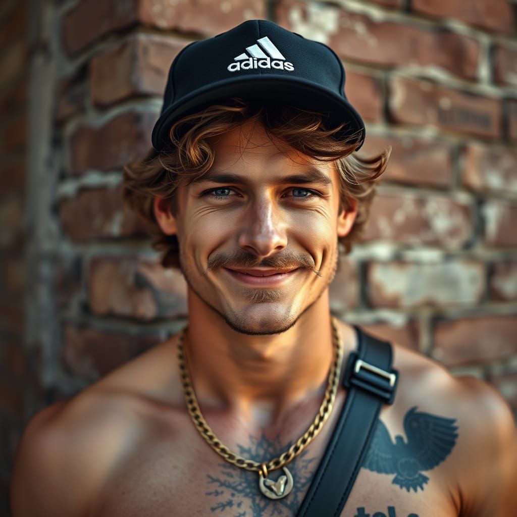 A detailed portrait of a smiling, athletic man with a mustache, wearing a leather harness and cap. The image is reminiscent of intimate portraiture with a cinematic quality.