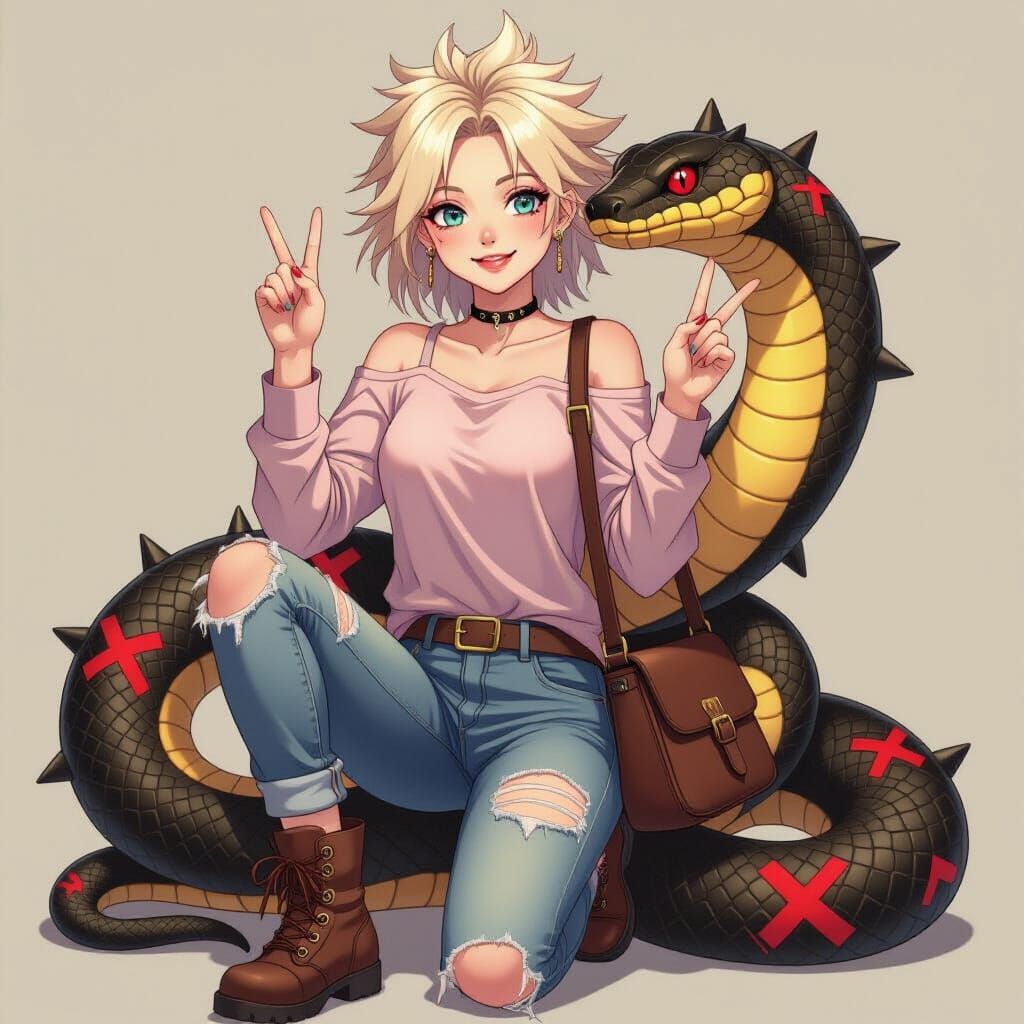This image shows a confident young woman with a black python. The woman has a cocky smile, two-toned hair, piercings, and casual clothing. The art style is reminiscent of 3D anime concept art.