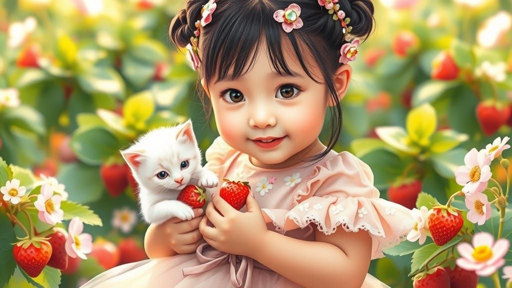This image shows a charming young girl surrounded by a lush strawberry patch, gently holding a kitten and strawberries, with intricate braids and colorful clips. The warm, golden color palette and soft textures evoke a sense of classic children's book illustrations.