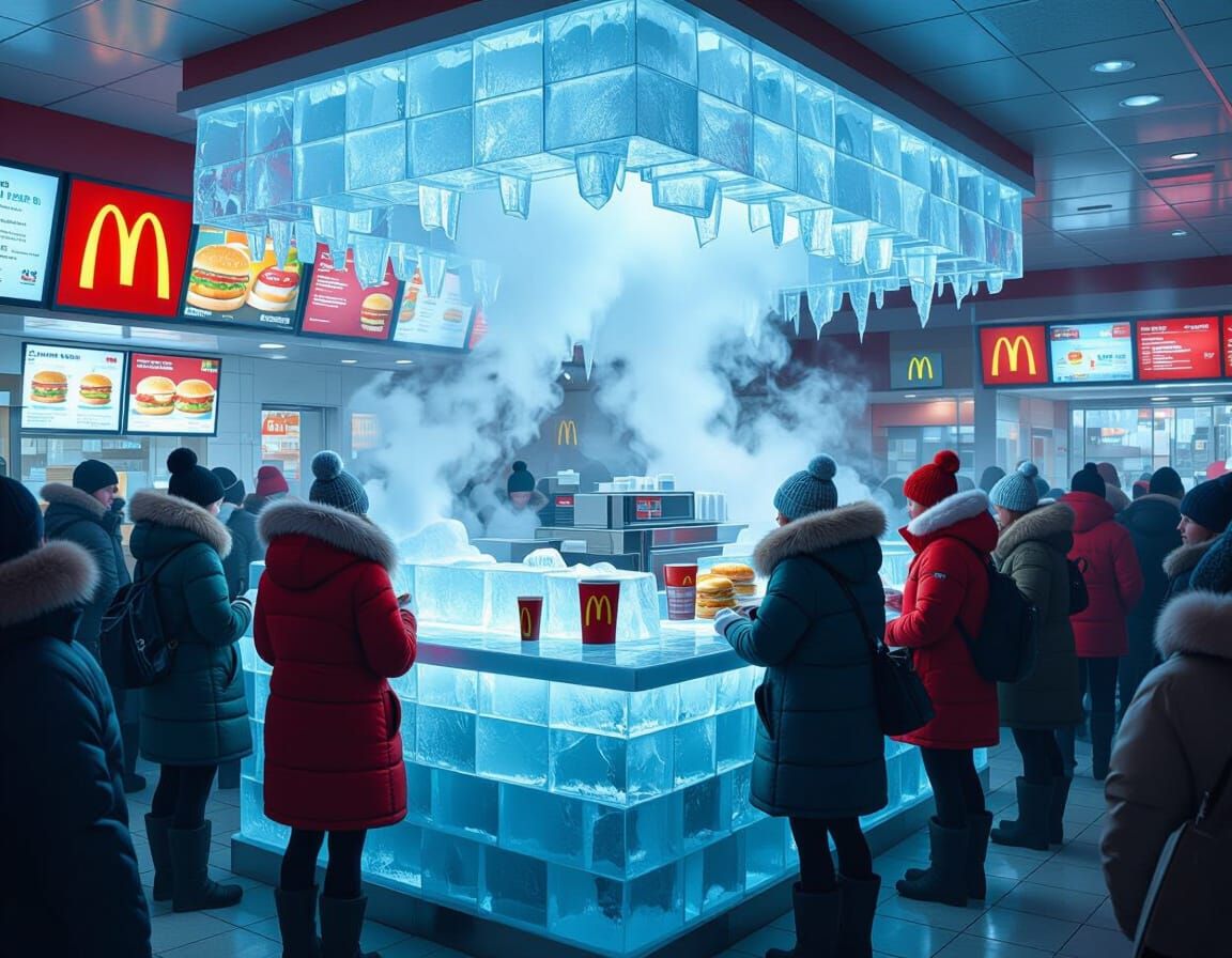 This hyperrealistic digital painting depicts a bustling McDonald's constructed from ice, with patrons in winter gear. Cool blue light and frosty steam create a surreal, frozen atmosphere.