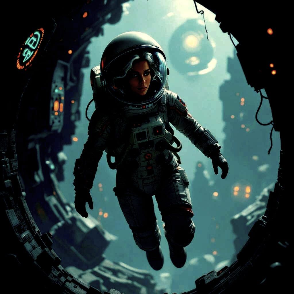 This image shows a lone astronaut drifting among the ruins of an ancient alien space station. The astronaut's vintage-style suit is illuminated by a soft nebula in this digital art piece.