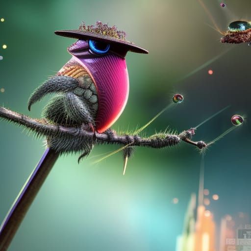 A striking picture of a cartoon bug with big eyes amidst energetic power fields. This sci-fi horror artwork features visible chakras, plants, and trees in a photorealistic style with dramatic lighting and intricate details.