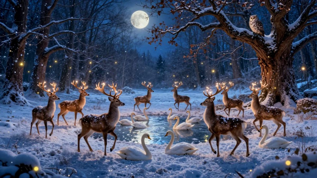 This image depicts a serene, storybook fantasy scene of animals celebrating New Year in a moonlit winter meadow with falling snow and shimmering light. Features glowing deer, swans on a frozen pond, and fireflies.
