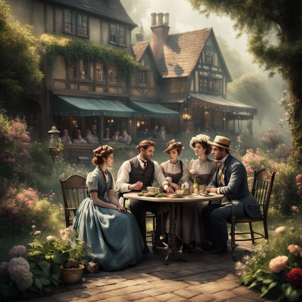 A close-up photo of a merchant family in vintage clothing at a tea table in a summer garden, bathed in cinematic shadows. The image has a nostalgic, ethereal fantasy style.