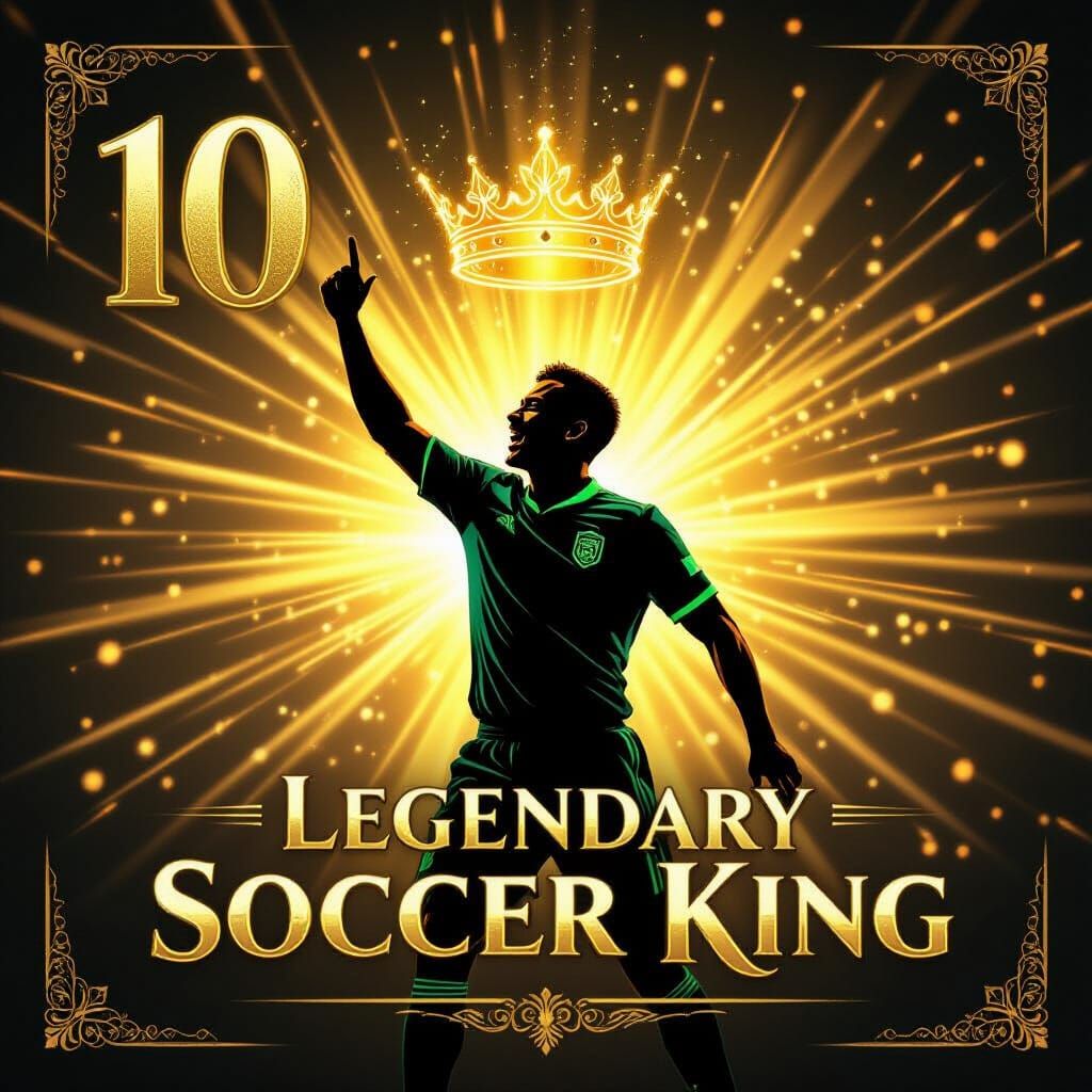 A rare, mythological soccer trading card featuring a silhouetted player with a golden crown, celebrating victory. Embossed golden lettering and divine energy create a premium, luminous aesthetic.
