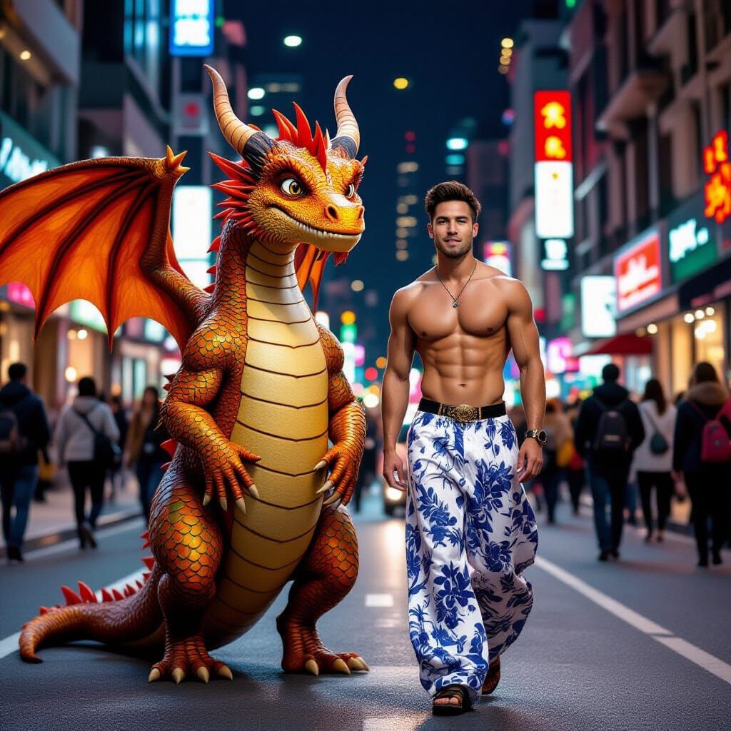 A striking picture of a shirtless man with a friendly dragon walking down a busy city street at night. The colorful dragon and stylish man create a whimsical scene of fantasy meeting urban life.