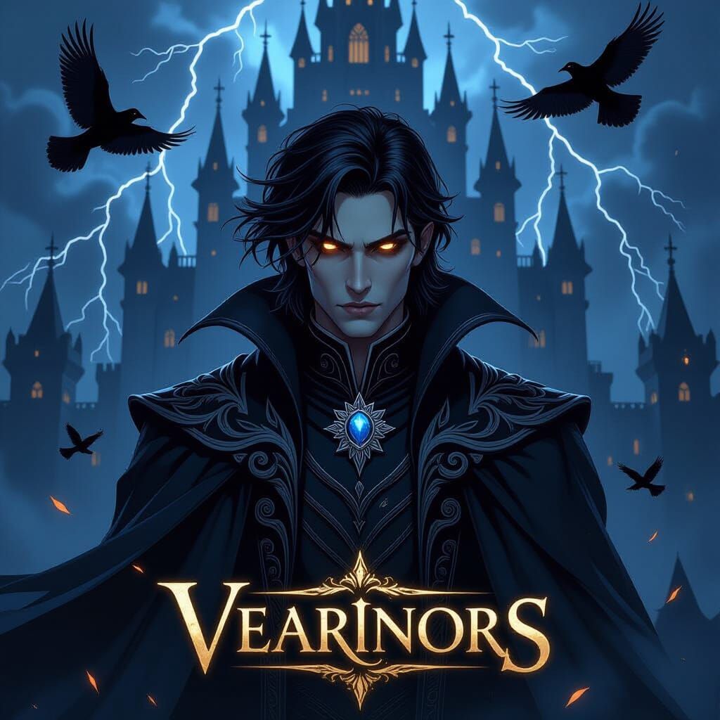 This image shows a dark fantasy book cover featuring a handsome villain. The character, wreathed in shadow and lightning, stands before a gothic castle under a stormy sky, rendered with bold lines in a dark, mystical style.