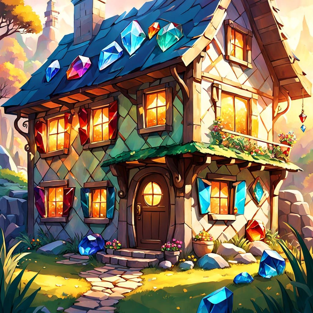 This detailed digital painting showcases a cozy, rustic cottage constructed from gleaming gemstones. It emits a warm, inviting glow during golden hour, creating a magical, storybook atmosphere.