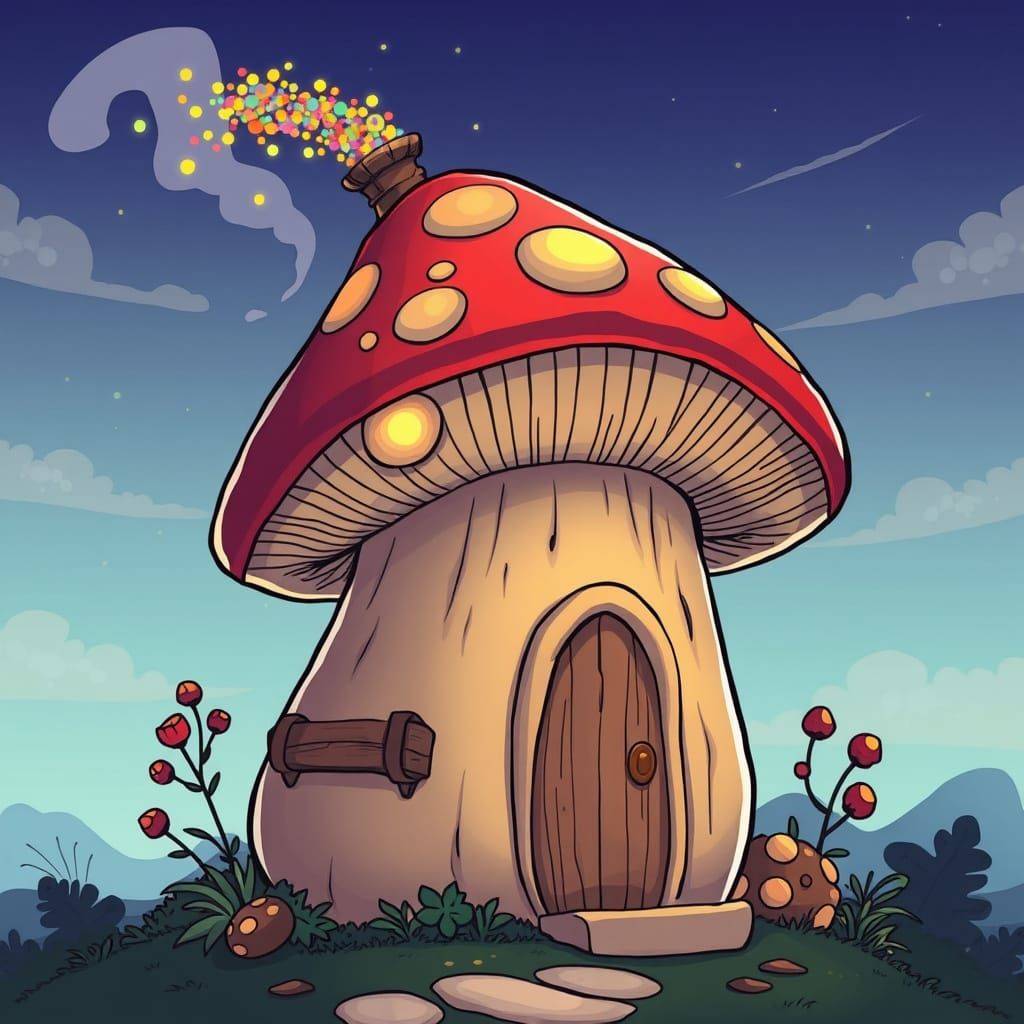 This image shows a whimsical, cartoon-style mushroom house with a chimney spewing colorful spores into a serene evening sky, reminiscent of comic book art.