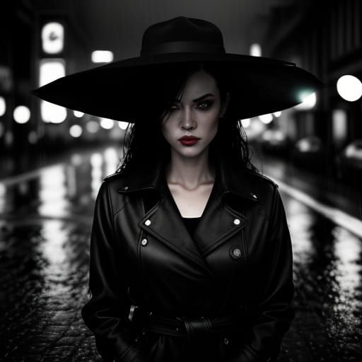 A close-up of a woman with a captivating, enigmatic expression, illuminated by city lights on a rainy night, with reflections on the wet pavement and a moody, cinematic atmosphere.