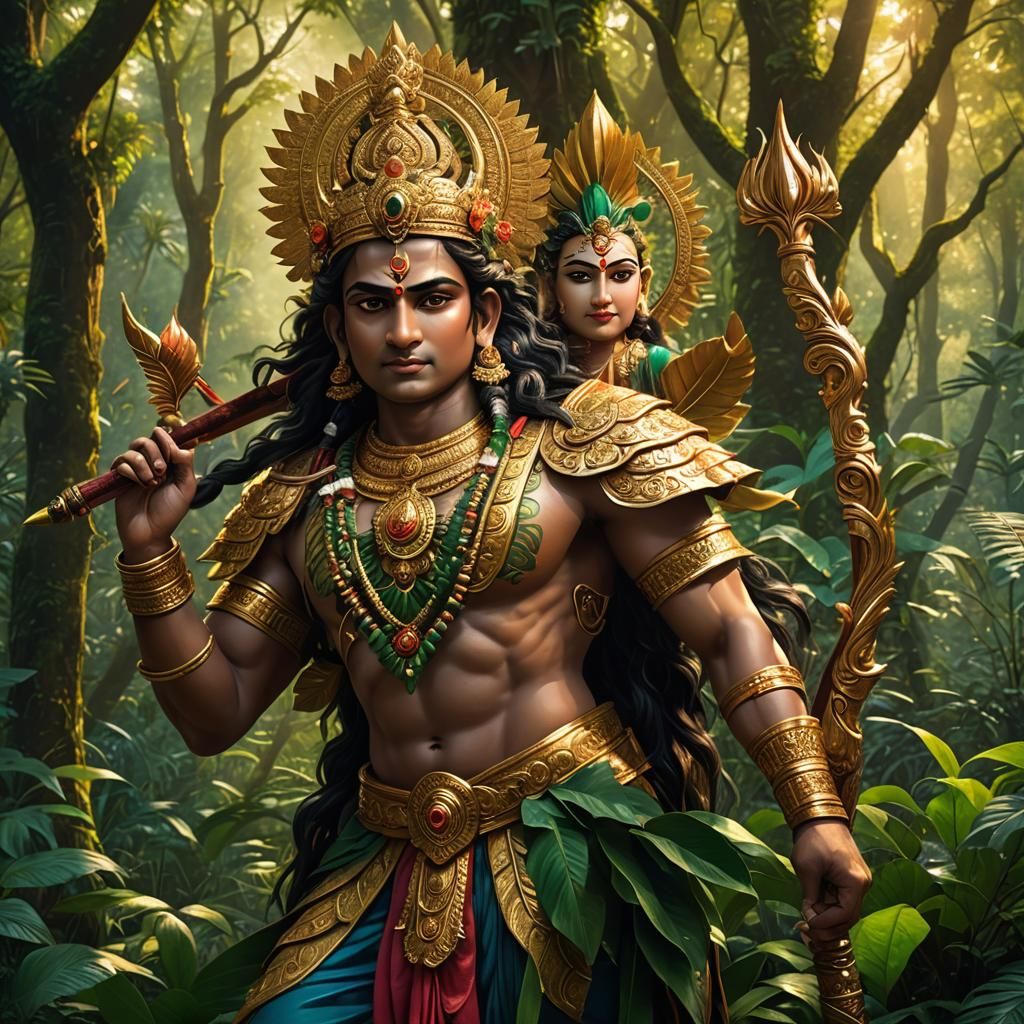 A detailed portrait of Rama holding the Sharanga bow in a forest. Golden light filters through the trees, illuminating his armor. The artwork features complementary colors and realistic anatomy as digital fantasy art.