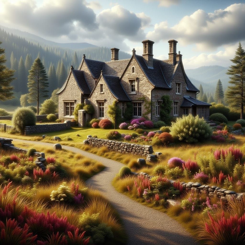 This image showcases a beautiful historic manor house nestled in the Scottish Highlands, featuring old fields and stone walls, rendered in rich, saturated colors.
