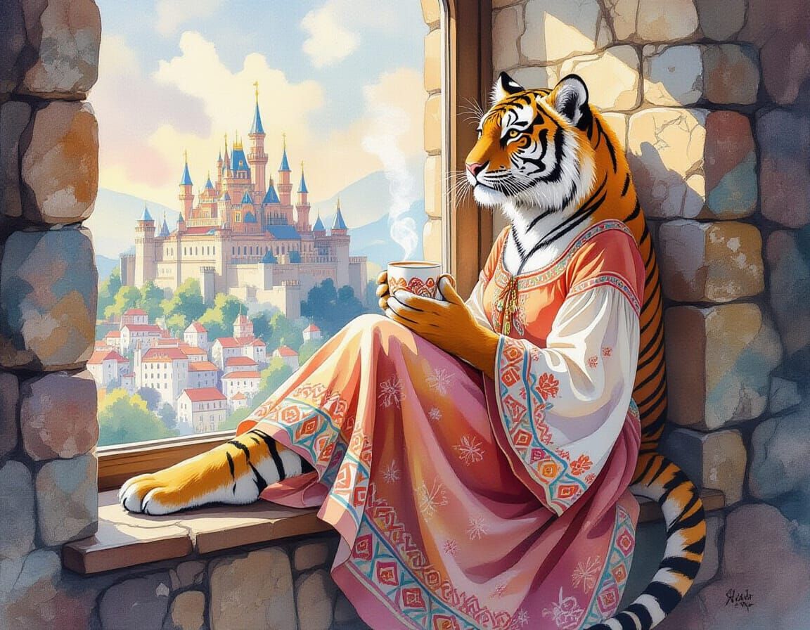 This image shows a tiger in a folk dress sitting on a windowsill. The tiger holds a hot chocolate while gazing at a kingdom below, rendered with impressionistic brushstrokes.