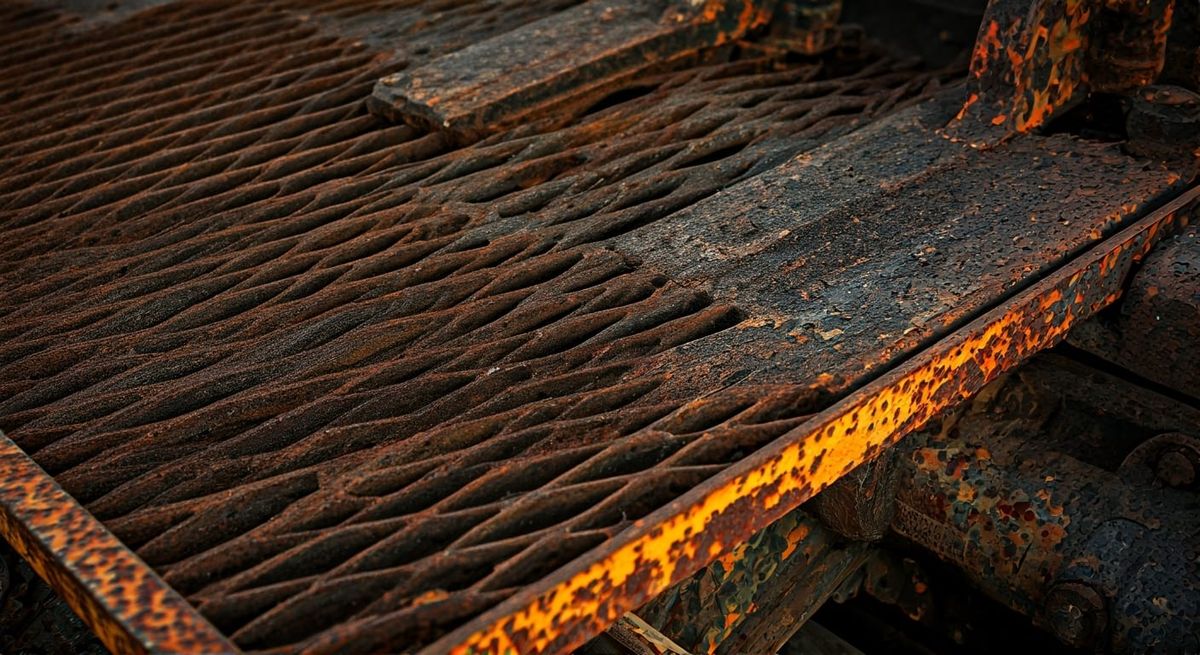 A close-up photograph of decaying industrial machinery. The image showcases rusted metal, peeling paint, and corroded surfaces, capturing the essence of mechanical realism and abstract industrial decay.