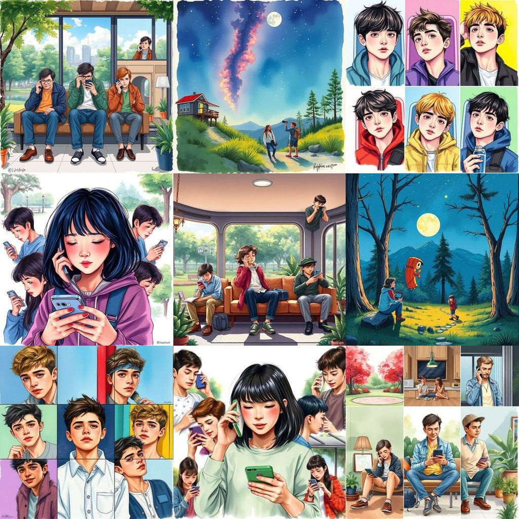 This image showcases six young individuals deeply engaged with their smartphones in various everyday scenarios, blending vibrant watercolor style with subtle gothic and hyperrealistic elements.
