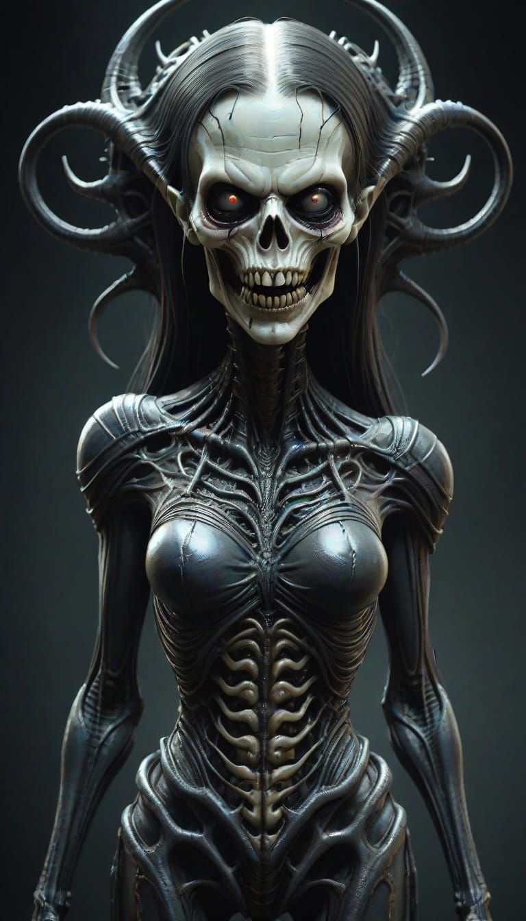 This AI-generated image depicts a terrifying female vampire in a zombiecore aesthetic, influenced by the dark, biomechanical style of H.R. Giger.