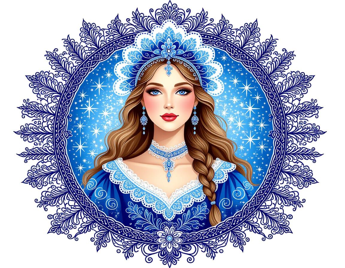 This image depicts a scene from a Russian fairy tale, showcasing intricate lace designs in a Gzhel-inspired cobalt blue and white palette. It features fractal details and subtle glitter, rendered with an airbrushing technique.