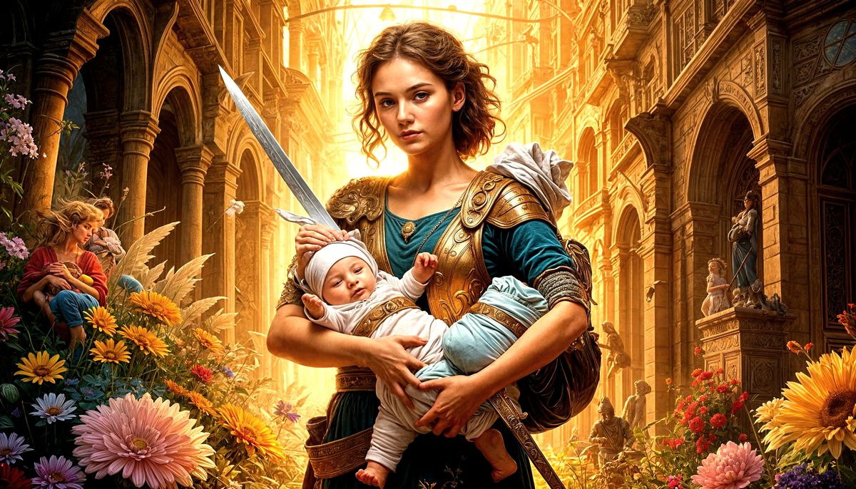 This image depicts a fantastical mother figure balancing a sword and a diaper bag, symbolizing the unique blend of strength and nurturing that defines motherly love.