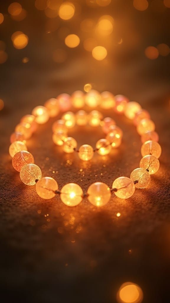 This image shows glowing prayer beads arranged in a perfect circle, each radiating soft light. Spiritual energy lines connect the beads amidst a warm, golden glow, creating a meditative atmosphere in an art nouveau style.