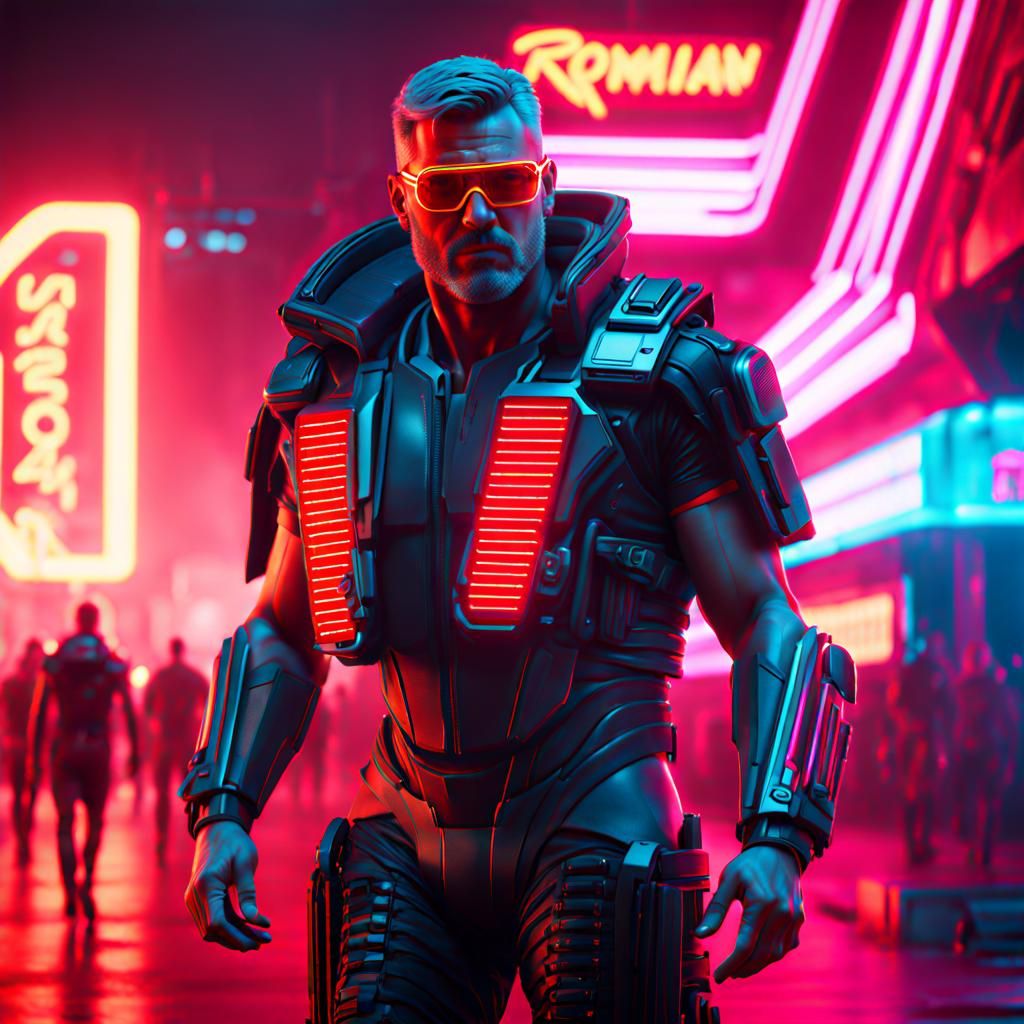 A futuristic Roman centurion rendered in a cyberpunk aesthetic. The image features neon lighting and a hyper-detailed background with perfect anatomy.